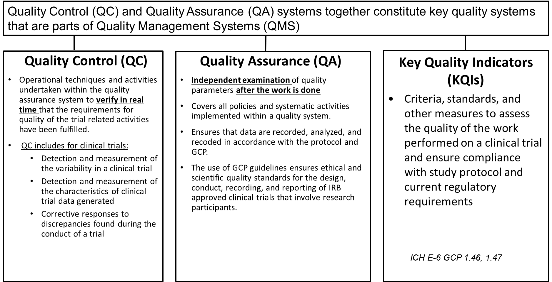 Monitoring of clinical sites and technical facilities should be conducted on site or by using centralized monitoring techniques for data management and quality control (QC), and internal and external audits performed by independent auditors [1]. Quality Control (QC) and Quality Assurance (QA) systems together constitute key quality systems that are parts of Quality Management Systems (QMS) as shown on Figure 2 [2,3].
