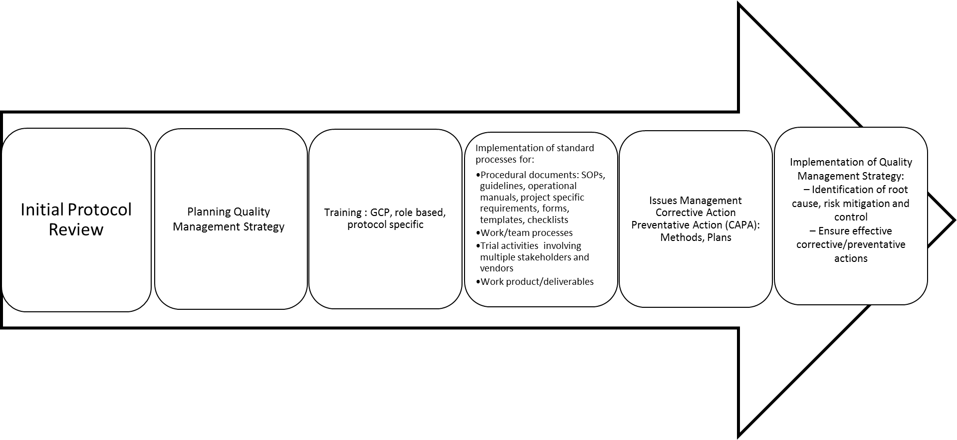 Quality Management Systems (QMS) are based on a methodology to produce reliable and high quality end results as a systematic deliverable by developing verifiable standards for processes that can control for variation [1]. In order to sustain QMS procedures must be developed and documented, then implemented and updated throughout a life cycle of a project (Figure 1). Training of sponsors, contract research organizations (CROs) and site personnel must be conducted on QMS, and computer systems utilized in quality management must be validated.