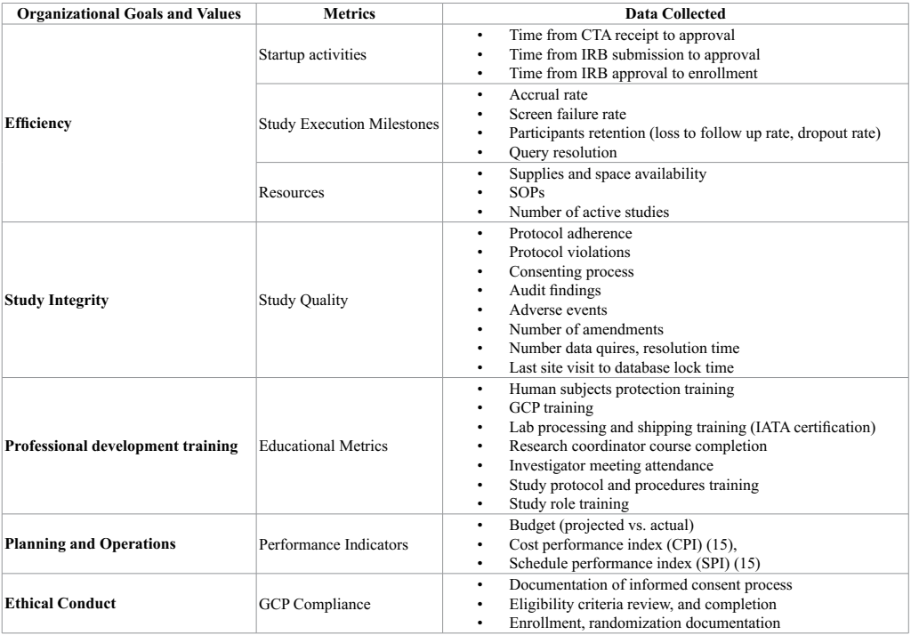 Organizations conducting clinical research can benefit from establishing quality and risk management systems to measure performance, using objective metrics to measure efficiency, safety and quality. The development of metrics involves identifying the values of an organization and the goals that express those values, developing measures to assess meeting those goals, and building infrastructure to capture data to support the metrics and develop adequate and timely response to drive improvement.