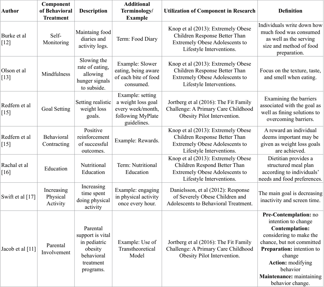 Behavioral therapy encompasses a variety of methods including self-monitoring, stimulus control, slower eating, goal setting, behavioral contracting, education, increasing physical activity, and parental involvement [11]. See Table 1. Self-monitoring through food diaries and/or activity logs, allows individuals to track daily activities [12]. Stimulus control allows environmental modification to prevent overeating. For instance, limiting the availability of non-nutrient dense food items in an individual’s home creates an encouraging environment to eat healthfully. Eating at a slower rate embodies mindfulness, allowing individuals to focus on food texture, smell, and taste [13, 14]. Behavioral contracting and goal setting go hand in hand as positive reinforcement (i.e. rewards) aid individuals in meeting their weight loss goal [15]. Nutrition education provides skill development to create a structured meal plan per one’s needs and food preferences. This is key for both children/adolescents and parents [16]. Increasing physical activity assists in positive reinforcement because it decreases screen time and increases fat loss [17]. Finally, social support and parent involvement are of upmost importance in pediatric behavioral therapy because both hold the power to instigate behavior change [11, 14]. Table 2 provides research studies that showed benefits of using behavioral treatment methods (Tables 1,2).